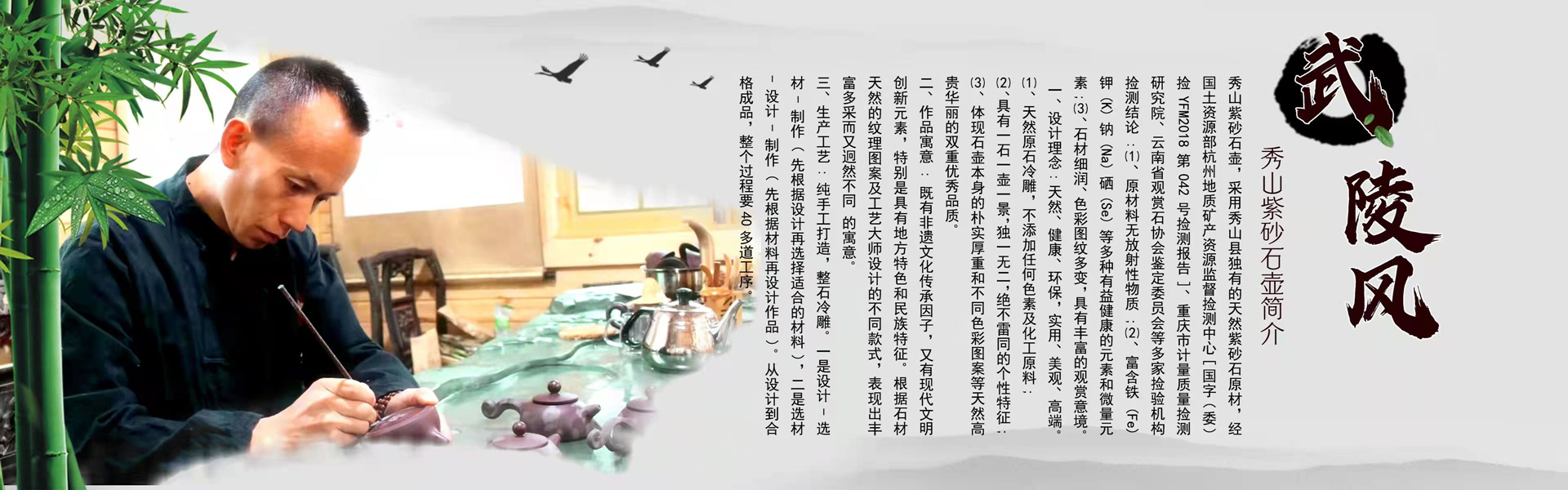 秀山"武陵风"品牌紫砂石壶,是重庆市(秀山)武陵风文化艺术有限责任公司推出的一款原生态高端茶壶,每一把石壶材料都源自秀山太阳山下的平江、梅江两条河道之中。 秀山武陵风文化艺术有限责任公司座落在秀山百年西街,建筑面积560平方米,厂房2000平方米,公司致力于打造成为秀山旅游文化产业的龙头企业,并于2016年8月向中国工商总局申报了武陵风商标;每年可产出优质紫砂石壶15000套。